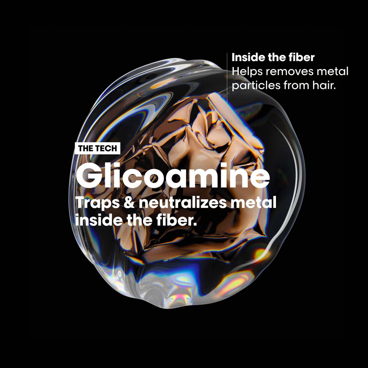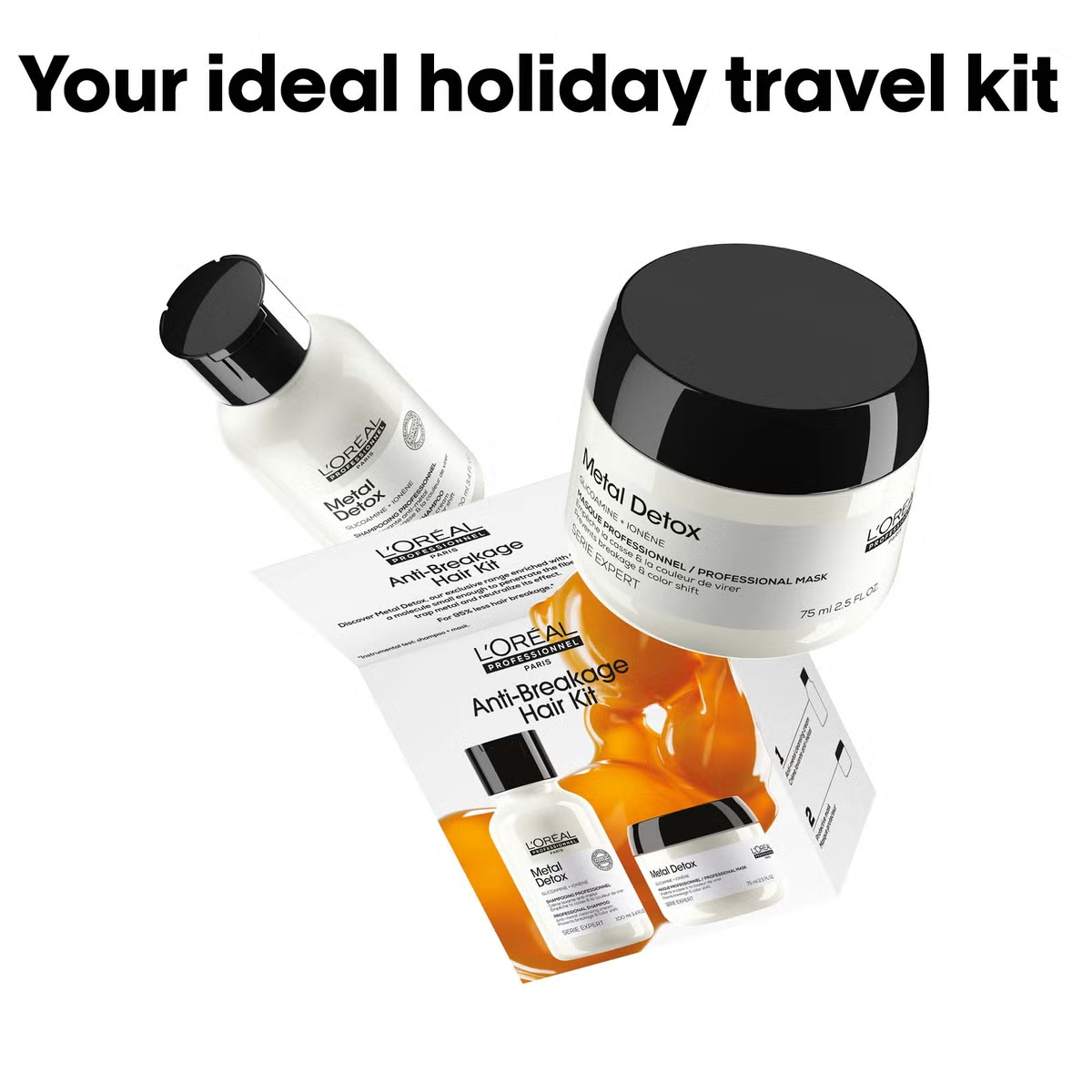 The L'Oréal Professionnel Metal Detox Shampoo & Mask Discovery Kit works to wash away and block copper deposits found in water. Excess levels of copper in your hair can be found when absorbed from shower water. Copper deposits are capable of dulling hair colour and causing breakage.  Arriving in travel sizes, the protecting bundle contains a shampoo and a mask enriched with glicoamine to help neutralise metals found in hair, offering 2x shinier hair and up to 87% less hair breakage in one use*.